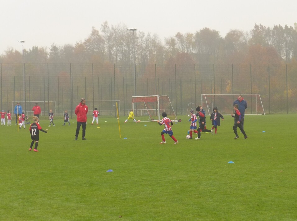 Die Nässe ist bei den Spielerinnen und Spielern schnell vergessen wenn es darum geht, Tore zu schießen. Bei den Jüngeren noch auf Minitore, die Äteren spielen bereits mit Torwart auf Kleinfeldtore.