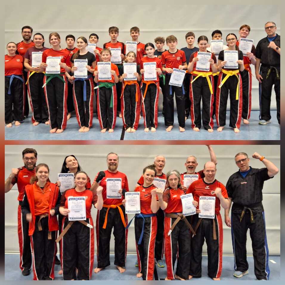 24 Kickboxerinnen und Kickboxer haben am Freitag in Fleestedt erfolgreich Leistungsprüfungen abgelegt und können daher künftig einen Gurt mit neuer Farbe tragen. Unter den kritischen Augen von Meister Oliver Born vom Kickboxcenter Hamburg und Meister Patrick Behrendt vom TuS Fleestedt zeigten die Prüflinge jeweils über 2 1/2 Stunden, dass sie die Anforderungen des Prüfungsprogramms der WAKO, des Kickboxverbandes in Deutschland, erfüllen konnten. Meister Oliver Born zeigte sich am Ende begeistert von den gesehen Leistungen, insbesondere auch von den vier neuen Braungurt-Trägern, die das anspruchsvollste Prüfungsprogramm zeigen mussten.