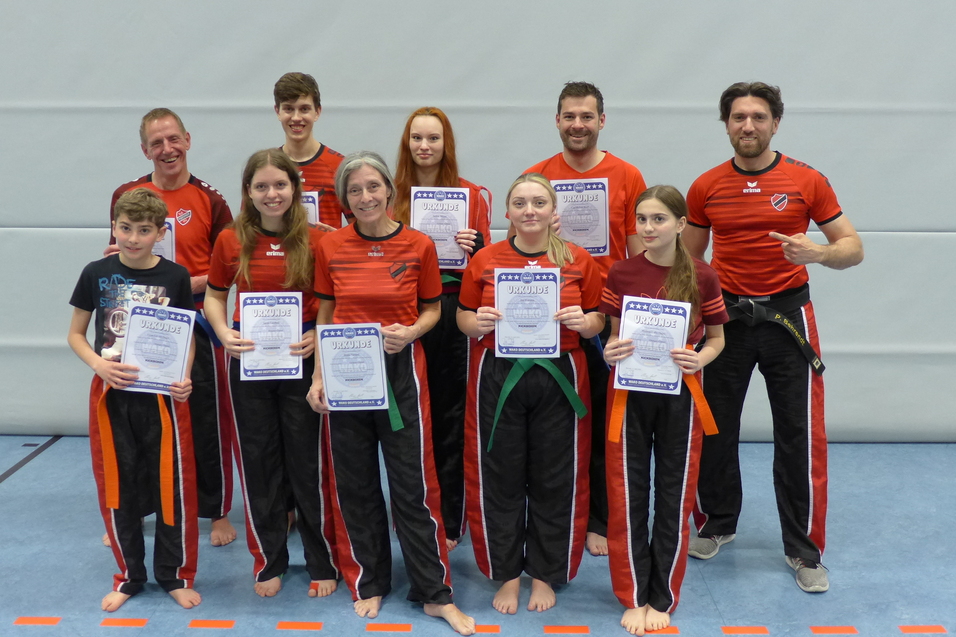 Meister Patrick (rechts) mit den neuen Sportlerinnen und Sportlern, die am letzten der drei Prüfungstermine erfolgreich teilnahmen.